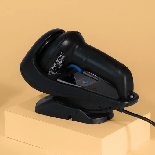 This Datalogic Gryphon barcode reader reads 1D and 2D barcodes. There are two models available, one with wire and one wireless. The reader with wire has a cable with a USB connection to attach it to another device. The wireless model has a Bluetooth range of 30m and comes with a charger/transmitter cradle that has a USB connection.